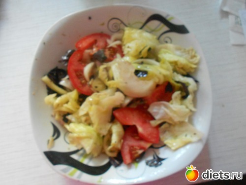 Ужин - овощной салат изсалатных листьев, помидоров, перца с луком, уксусом и маслом: