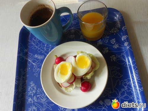 Завтрак: апельсиновый сок, кофе, яйцо на кусочке ржаной краюшки с салатом и редиской: