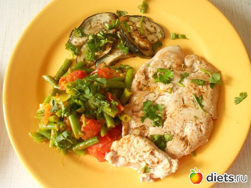 Обед - 200 г стейка из грудки индейки на сухой сковороде, ломтики баклажана, зеленая фасоль с луком и помидором:
