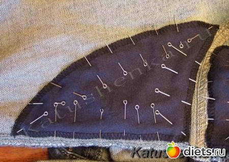 3. С изнаночной стороны джинсов накладываем и прикалываем булавочками заплатку (к изнаночной стороне джинсов лицевую сторону заплатки)