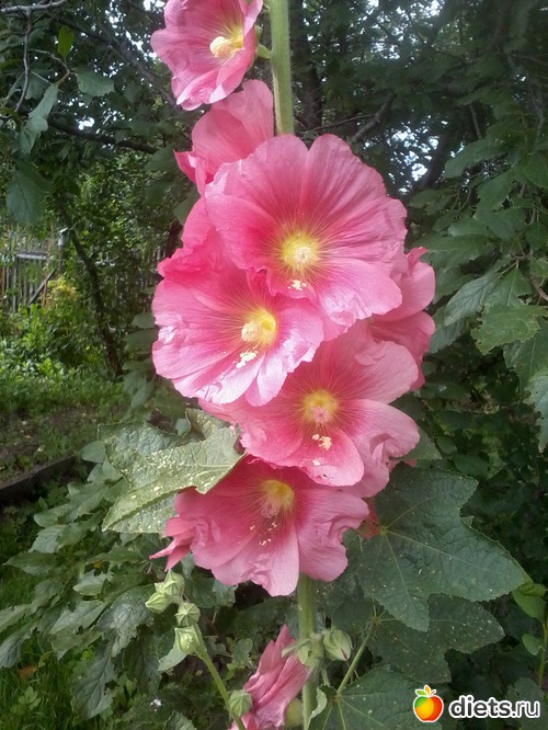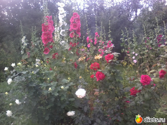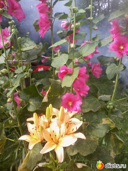 Многие считают мальву деревенским цветком, а я специально их развела на своем участке и теперь у меня есть нарядная живая изгородь, которая отделяет кусочек участка, где мы обычно отдыхаем, жарим шашлыки, коптим рыбку и в жаркий день я люблю сидеть в теньке и любоваться моими мальвами