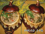 Сердечки отварить почти до готовности (я варила полчаса после закипания), воды должно быть достаточно, так как этот бульон потом заливается в горшочки. У меня воды был литр. Бульон посолить.
