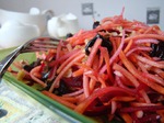 Все на тёрочку. Естественно все сырое. Сверху посыраем грецкими орехами, черносливом и чайная ложечка льняного масла - это не просто вкусно... а безумно вкусно