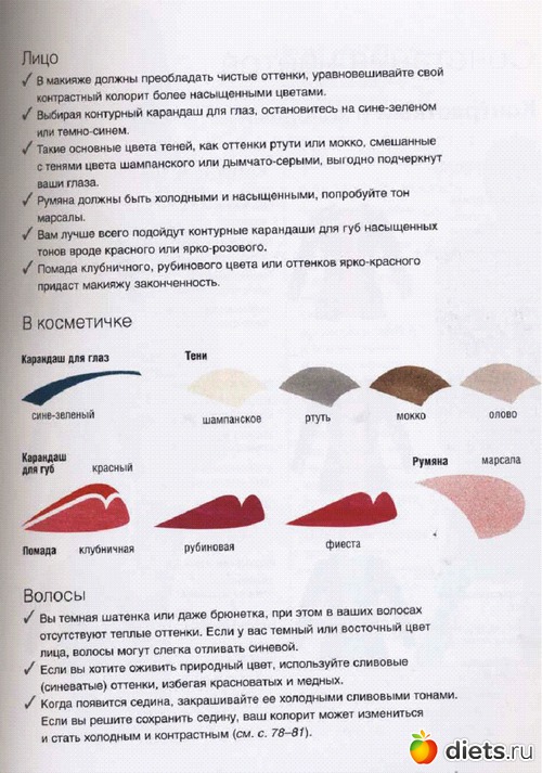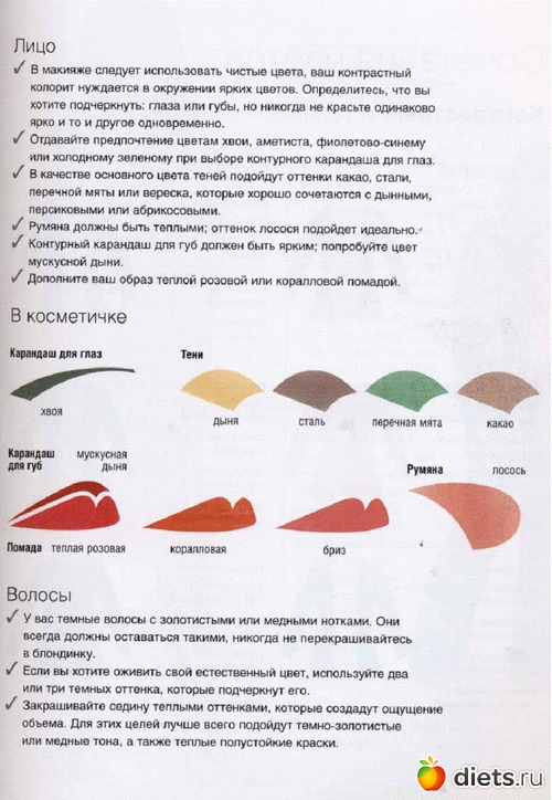 Цвета должны гармонировать с кожей, волосами и глазами. Для вас хороши контрастные сочетания светлого и темного. Цвета вроде серо-коричневого или "мокрого асфальта" дополняйте самыми яркими оттенками из вашей палитры. Основные нейтральные цвета, такие как черный, угольно-серый и темно-шоколадный сочетайте с более светлыми оттенками вашей палитры. Белый цвет дополняйте алым или черным.