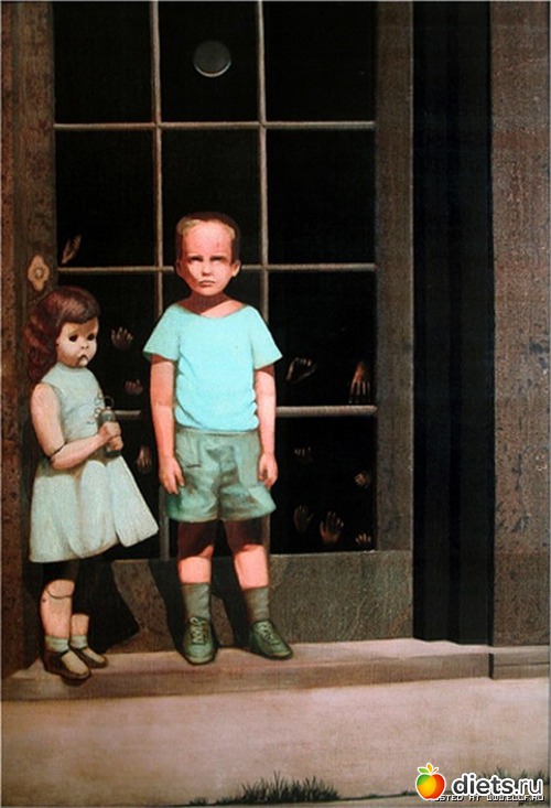 Может, все дело в искажении пропорций и формы, легком, заставляющем вглядываться? Посмотрите на голову мальчика: его макушка плоская, лицо тоже плоское и бесформенное, словно накрытое куском сырого теста. Посмотрите на дверь. У вас нет ощущения, что ростом мальчик выше взрослого человека, а дверь - огромна? Руки за невидимой преградой кажутся очень маленькими. Ноги у мальчика... в них тоже что-то не то...