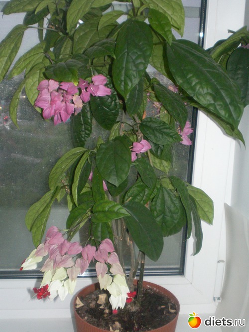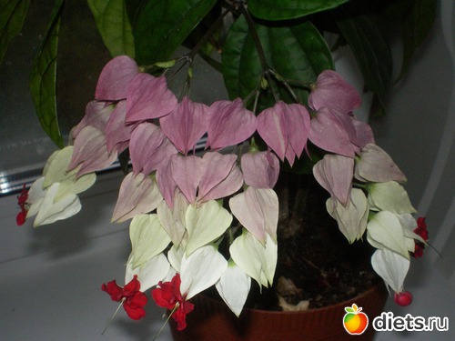 А это клеродендрум госпожи Томпсон радует меня уже не первый месяц! Вначале он весь в белых коробочках с красными язычками, а потом они опадают (язычки), а коробочки постепенно приобретают сиреневую окраску и ещё очень долго сохраняют декоративность!