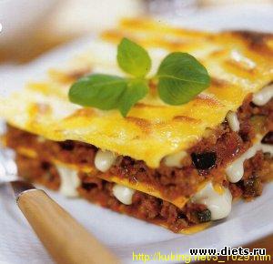 6. Взять форму для духовки размером 30х20 см. В основу положить пласт теста, затем слой половины соуса с мясом и 1/3 белого соуса. Затем положить еще слой теста, оставшийся мясной соус и треть белого. Накрыть оставшимся листами теста и залить белым соусом.