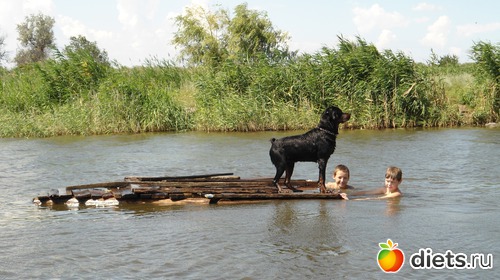 В один из жарких дней я с сыном и его другом пошли на речку прогуляться. Они покупаться, а я поснимать. Взяли конечно и Торреса с собой, пусть, думаю, остынет, поплавает. На речке мальчишки с собакой втроём прыгали с причала в воду и устраивали синхронный заплыв, потом играли "достань палку из воды", а под конец нашли плот и стали на нём кататься.