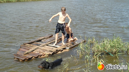 В один из жарких дней я с сыном и его другом пошли на речку прогуляться. Они покупаться, а я поснимать. Взяли конечно и Торреса с собой, пусть, думаю, остынет, поплавает. На речке мальчишки с собакой втроём прыгали с причала в воду и устраивали синхронный заплыв, потом играли "достань палку из воды", а под конец нашли плот и стали на нём кататься.