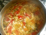 Все (кроме помидоров) режем, как, нравится, заливаем водой, варим минут 15, потом добавляем лапшу и помидоры, варим еще 5 минут.