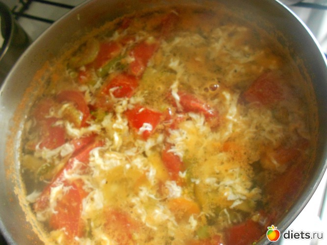 Заправляем суп, постоянно помешивая, взбитым яйцом.