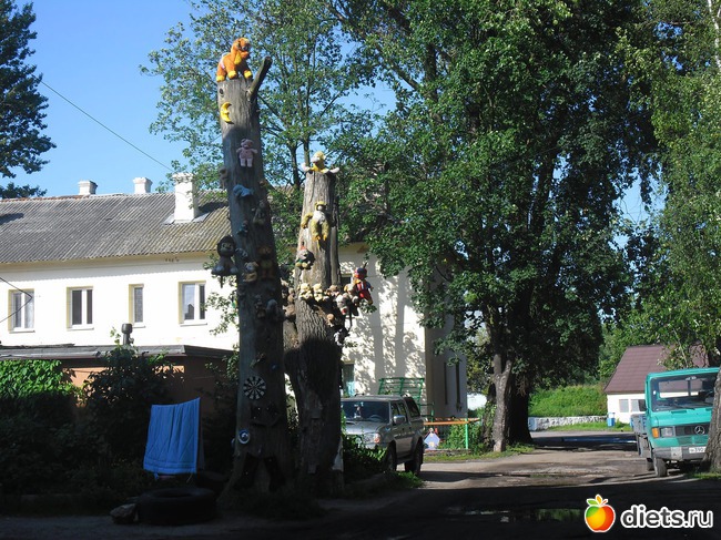 Много интересных дворов. Фотография не очень получилась. Здесь столбы, а на них мягкие игрушки. Что означает - не знаю.