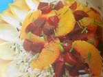 4. Смешать все ингредиенты для соуса. Выложить свеклу с апельсином на рис (так, чтобы он чуть выступал). Полить все соусом.