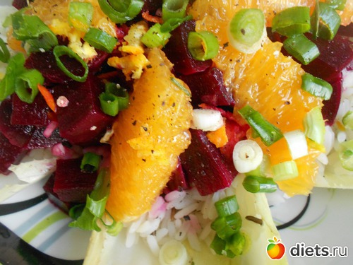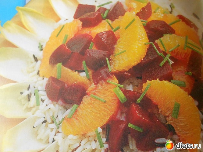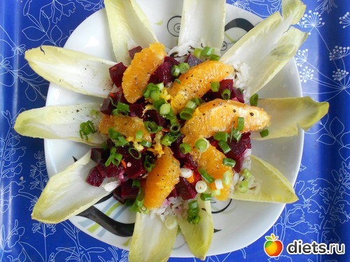 2. Рис смешать с отжатым апельсиновым соком, посолить, поперчить, выложить на середину "цветка" из цикория.