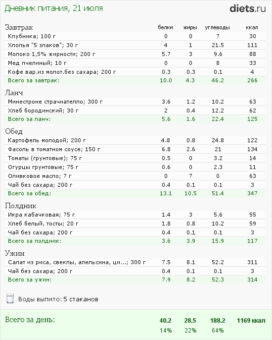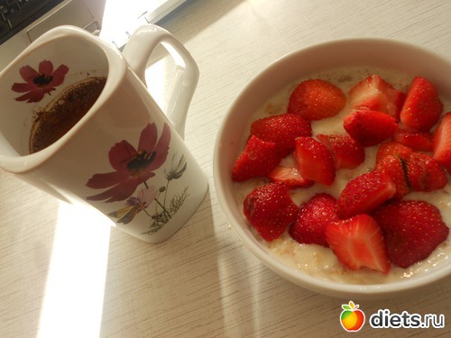 Завтрак был такой: каша из пяти злаков (овес, ячмень, пшено, рожь, пшеница) с клубникой, кофе:
