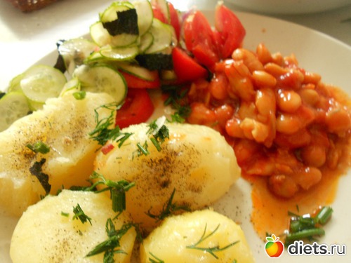 - вареная картошка, фасоль в томатном соусе, салат из помидоров-огурцов: