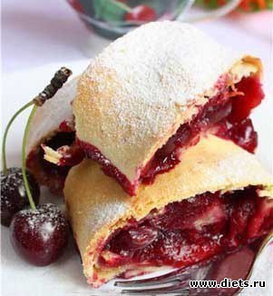 Из теста сформировать приплюснутый ком, смазать его жидким маргарином и поставить в теплое место на 30 минут. Раскатать тесто в тонкий пласт, 2_3 его посыпать поджаренными в половине маргарина, панировочными сухарями, сверху выложить вишню без косточек, присыпав сахаром и корицей. Выпекать 10-15 минут при температуре 200˚ С, до появления коричневатого оттенка.