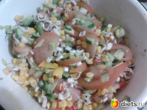 Пол авокадо, два помидора, пять огурчиков, маленький перчик, пачка крабовых палочек, консервная баночка кукурузы, 4 ст. ложки оливкового масла. Красота!