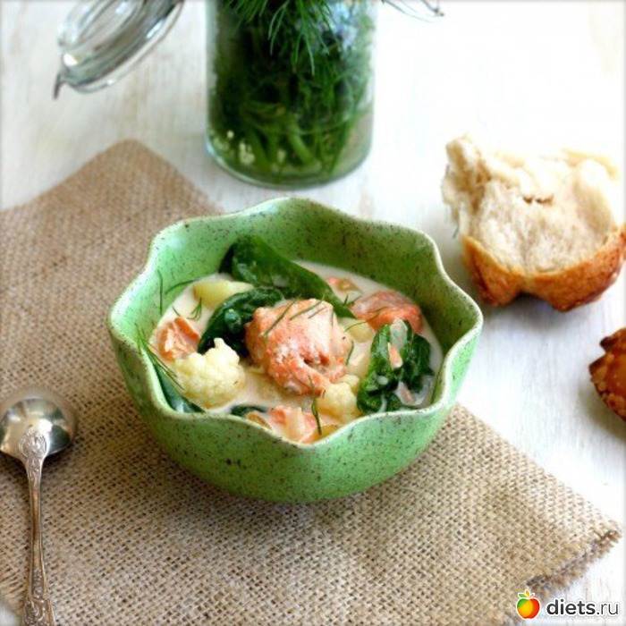 Нагрейте масло в кастрюле на среднем огне, обжарьте лук до прозрачного состояния около 2 минут. Добавьте муку и готовьте, помешивая, около 2 минут. Влейте воду и перемешайте вместе с мукой и луком. Выложите картофель, цветную капусту. Варите под крышкой до готовности картофеля (около 15 минут). Добавьте паприку, табаско, молоко и сливки. Доведите до кипения, а затем уменьшите огонь. Выложите в кастрюлю нарезанное филе рыбы и варите столько, сколько необходимо, чтобы она проварилась. Затем выложите нарезанный или порванный руками шпинат и держите еще с минуту на огне. Посолите и поперчите по вкусу. Разлейте по тарелкам и подавайте немедля.