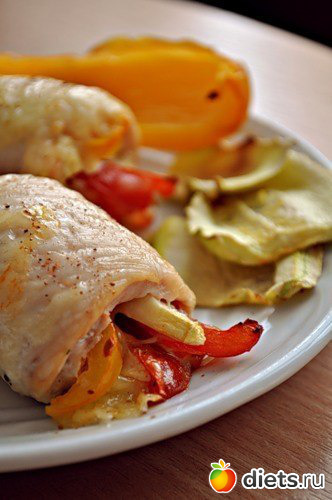 3. В середину каждого кусочка птицы положить несколько полосок овощей и сыра. Закрепить шпажками.