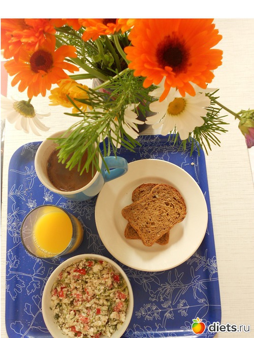 Завтрак был под их сенью - тосты с творожком с овощами, сок, кофе: