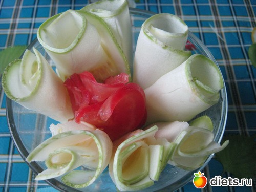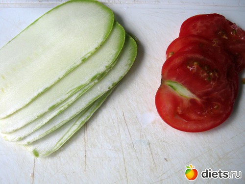Кабачок и помидор нарезаем тонко или используем для этого тёрку "Бёрнер".