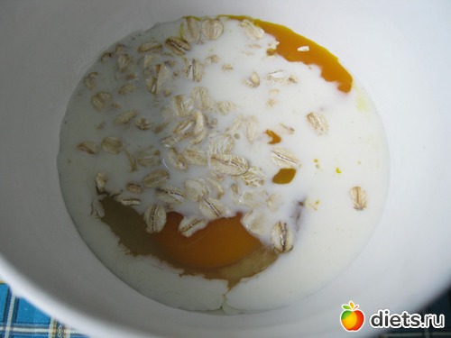 Берём яйцо, молоко, овсяные хлопья, соль, взбиваем венчиком.