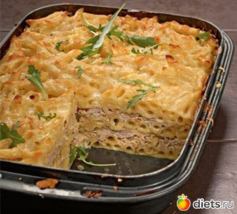 В прямоугольную форму уложить 1/3 макарон, затем половину подготовленного фарша. Присыпать 1/3 сыра. Выложить еще 1/3 макарон и оставшийся фарш, присыпать половиной оставшегося сыра. Сверху положить оставшиеся макароны, посыпать оставшимся сыром. Накрыть крышкой и поставить в разогретую до 190°С духовку на 30 мин.