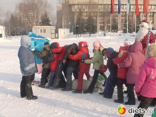 2. Два мороза. Выбирается площадка, на обеих сторонах которой отчерчиваются (или по-другому отображаются, например, камешками или условно) домики. В начале игры все игроки в одном доме. Два мороза (ведущие) на середине поля. По сигналу все игроки бегут в другой дом. Морозы стараются поймать как можно больше. До кого дотрунились Морозы, замирает и расставляет широко ноги. Другие игроки могут его спасти, пролезая между ногами. Задача Морозов поймать всех игроков.