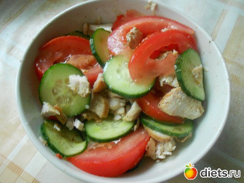 И сделала себе салатик из куриной грудки, помидора и огурца: