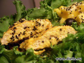 Рыба с зеленым салатом, кунжутом и маслинами