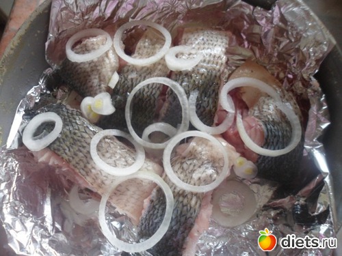 Наконец заложила емкость фольгой и выложила туда рыбку вперемешку с луковыми кольцами, немного посолила. Никакого масла - все должно быть супер-диетично, в собственном соку, как грится: