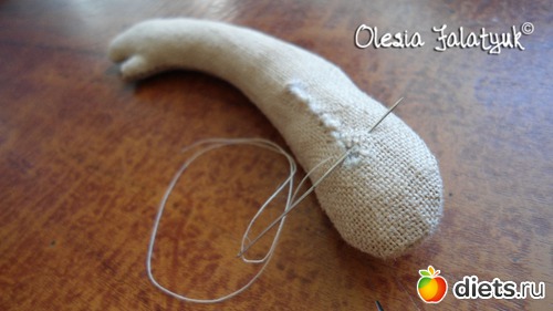 Набивая тулувище начинаем с шеи. Делаем это очень плотно, а в начале плечей, чтоб шея не опускалась, прошпиливаем её иглой/булавкой. И спокойно продолжаемнабивку. Набивать нужно конечно плотно, но чрезмерность грозить лишним весом, будте на чеку)