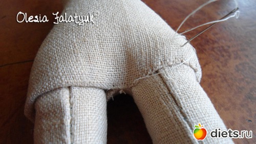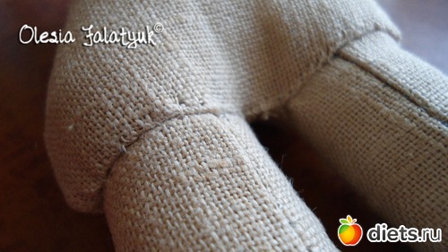 *Если набить ноги по всей длине кукла будет стоять, если оставить свободной верхнюю часть бедра, то кукла будет сидеть. Можно так же оставить менее набитыми коленки и стянуть их ниткой, тогда кукла сможет не только сидеть, но и сгибать ноги в коленях.