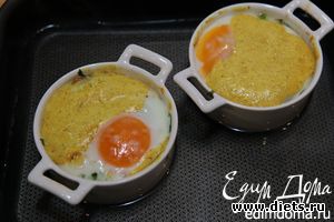 Влить в каждую форму по 1 ч. ложке сметанного соуса, равномерно распределить, а сверху разбить по яйцу так, чтобы желток не растекся. Добавить еще по 1 ч. ложке соуса, немного посолить.