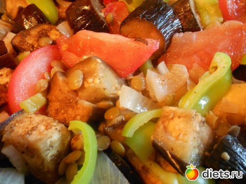 Взяла баклажаны, репчатый лук, чечевицу (предварительно замоченную), сладкий перец, помидор и все потушила на смеси подсолнечного масла и воды. Из пряностей добавляла смесь трав и куркуму. Чеснок не клала, потому что мужу моему его временно запретили. Что же я буду дразнить человека?