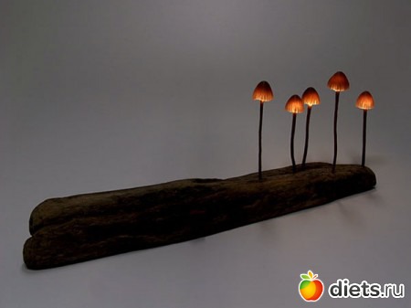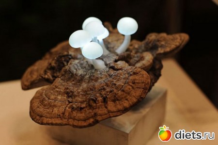 Светящиеся грибы, так похожие на настоящие, сделаны из стекла со светодиодной подсветкой внутри.