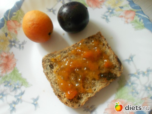 Второй завтрак - сливка, абрикосик и кусочек хлеба "мюсли" с абрикосовым джемом к кофе.