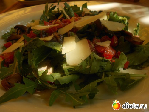 Вкуснейший салат из рукколы, шампиньонов, помидоров конкассе и кедровых орешков с хлопьями пармезана.