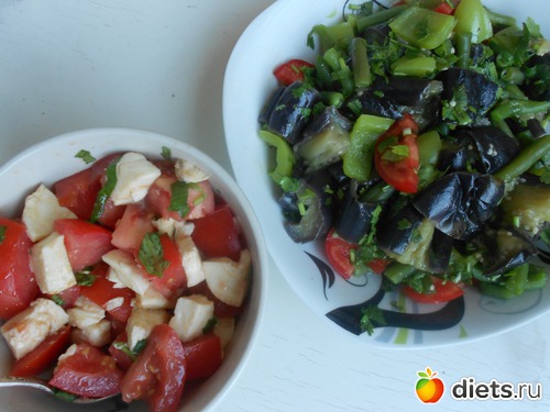 То, что слева, это вариант капрезе, в салате помидор, легкая моццарела, базилик, масло и бальзамико.