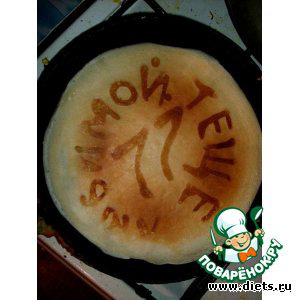 Кулинарным шприцем, на раскаленной сковороде, пишем текст в зеркальном отражении, или наносим смешной рисунок... Даем надписи немного подрумяниться и поверх заливаем блинным тестом всю площадь сковороды.