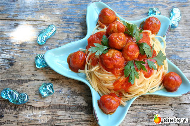В это время отварила лингвине до состояния "аль денте", смешала с соусом и фрикадельками и подала. Просто, вкусно и сытно.