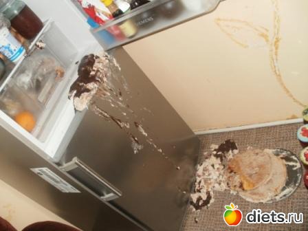 )и сделала птичье молоко коржи с пропиткой белым вином и кремом.в суфле спрятались свежие малинки(сама собирала))2 часа его делала и вот последний штрих покрыла шоколадной глазурью и убрать в холодильник в холодильнике была свободна только верхняя полка..я даже и не поняла толи он с рук у меня выскользнул толи дно формы выскочило.но стою я в шоке смотрю на это великолепие..