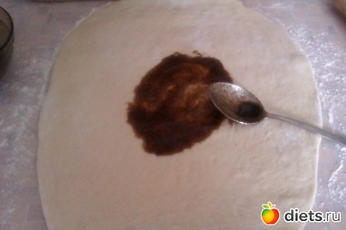 3 для начинки растопить масло, добавить сахар и корицу. Поднявшееся тесто раскатать в прямоугольный лист, намазать поверхность начинкой.