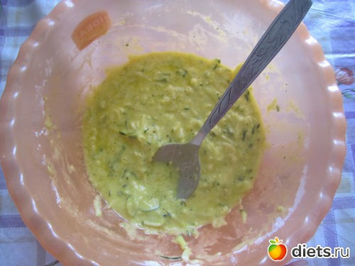 * Если кабачок не молодой - обязательно срезать грубую внешнюю кожуру и удалить семена. Добавить натертый кабачок к яичной массе и перемешать. Добавить муку и еще раз хорошо перемешать.