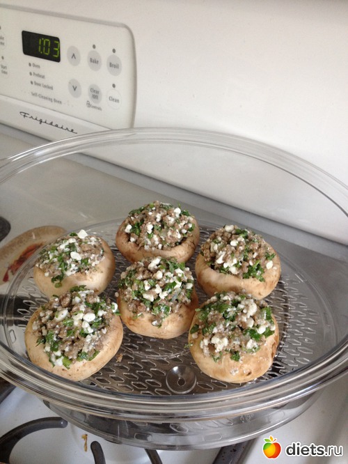 Все перемешать, плотненько набить шампиньоновые шапки и в пароварку - среднее корыто.