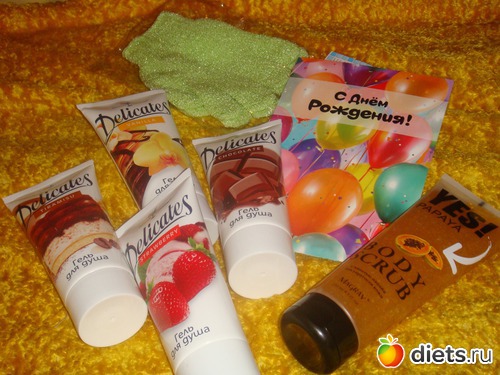 Подарили мне целый пакет всяких разных штучек. Это гели для душа с ароматами ванили, шоколада, клубники, тирамиссу( мой любимец), скраб для тела( кстати очень классный и ароматный) и перчаточки-мочалочки!