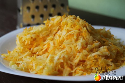 У кабачков срезаем попки с двух сторон и трем на средней терке. Кожуру и семечки можно не доставать, если кабачок молодой и очень мягкий: