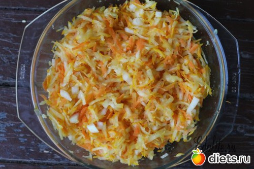 Затем, хорошо отжимаем кабачок и морковку и перемешиваем в одной миске вместе с луком. Немного солим и перчим:
