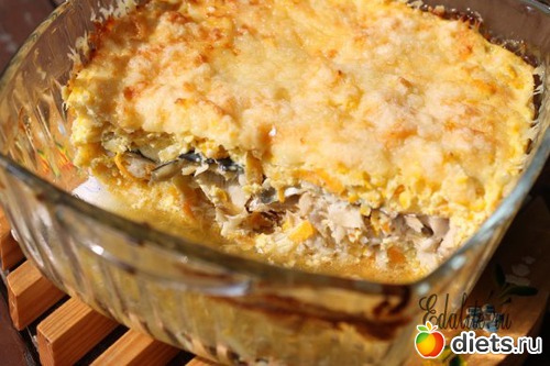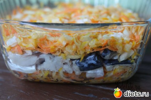 Берем форму для выпекания и в нее выкладываем: первый слой — половина смеси кабачка, морковки и лука; второй слой — рыбу; и третий — остальную половину смеси: